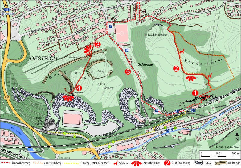 verbaute- Bachschwinde überflutet wurde. Im Steinbruch (Parkplatz 2) können wir mehrere Höhlenöffnungen erkennen z.B. die Schleddehöhlen.