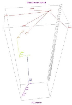 | Dreidimensionale Ansicht des Polygonzuges mit dem Programm CaveRender. Die Messlinien sind nach Tiefe farbig markiert. | Fertiger Aufriss des Gauchenschachtes. Bei tiefen Höhlen ist der Aufriss oft mehrsagender als der Grundriss. |  Im Rahmen vieler Projekte wurden neue Höhlenpläne erstellt oder ergänzt. Für Detailpläne wird meist der Maßstab 1:100 verwendet. Dies ist in vielen