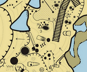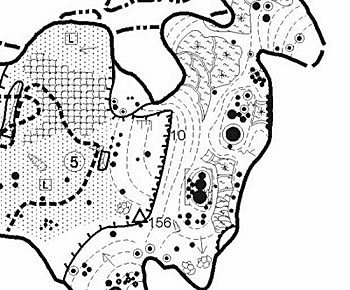 | Ausschnitt eines Grundriss-Planes mit Höhleninventar in Schwarz/Weiß. | Ausschnitt eines Grundriss-Planes mit Höhleninventar in Farbe. |