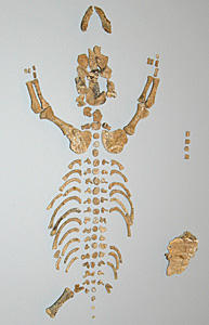 Fossile KnochenfundeIn den mehrere Meter tief herabreichenden Bodenschichten der Dechenhöhle wurden tausende Knochen und Zähne der Tierwelt des Eiszeitalters entdeckt. Vorherrschend sind Überreste des Höhlenbären, vertreten sind auch Höhlenlöwe, Höhlenhyäne, Rentier, Riesenhirsch, Mammut und wollhaariges Nashorn. 1993 entdeckten Höhlenforscher einen vollständig erhaltenen Oberschädel des seltenen Wald- oder Merck`schen Nashorns in einer Nebenhöhle der Dechenhöhle. Dieses Nashorn lebte im Gegensatz zu seinen behaarten Verwandten in den Warmzeiten und ist vor etwa 80.000 Jahren ausgestorben. Der Schädel ist im Höhlenkundemuseum ausgestellt. Januar 2000 wurde bei einer wissenschaftlichen Grabung das Skelett eines Höhlenbären-Babys entdeckt. Die zahlreichen Knochen des Höhlenbären zeigen, dass dieser Großbär die Dechenhöhle zum Winterschlaf und als Sterbeort aufgesucht hat.Spuren der Anwesenheit des Menschen wurden bislang in der Dechenhöhle nicht gefunden. Allerdings gibt es Zeugnisse einer Besiedlung des Grüner Tals durch Neandertaler, wie Funde von Steinwerkzeugen in benachbarten Höhlen belegen. Darüberhinaus fanden Höhlenforscher 1992 in der talaufwärts gelegenen Bunkerhöhle vom Urmenschen bearbeitete Skeletteile einer 45.000 Jahre alten Rentierkuh. Auch diese Knochenfunde sind im Museum zu besichtigen. |