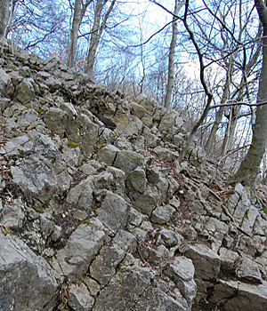 Im nachfolgenden Karbon wurden die Kalksteine zusammen mit den unter- und überlagernden Sand- und Tonsteinen zum varistischen Mittelgebirge aufgefaltet. Daher sind die ursprünglich waagerechten Gesteinsschichten in der Dechenhöhle und ihrer Umgebung heute schräg verstellt. Das spröde Kalkstein zerbrach bei diesen Faltungsvorgängen wiederholt. |