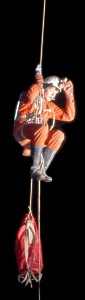 in kompletter moderner Ausrüstung seilt sich sogar an der Decke nach oben.